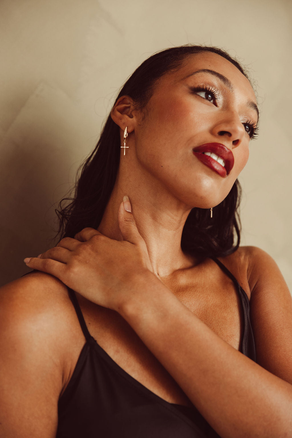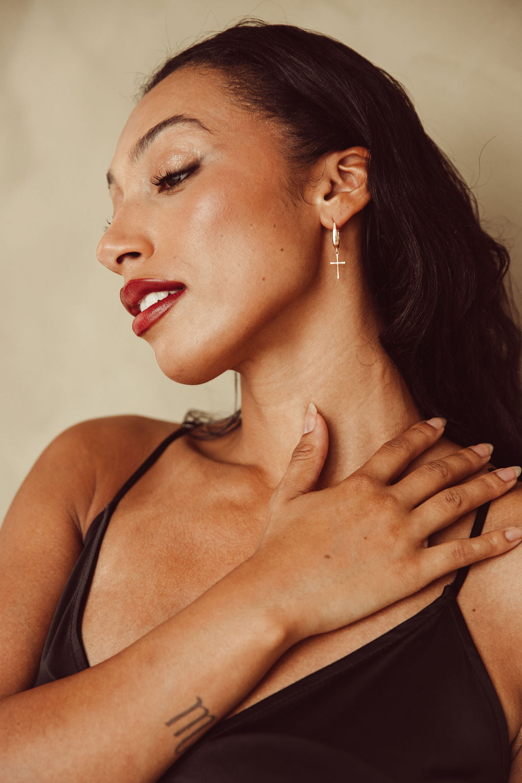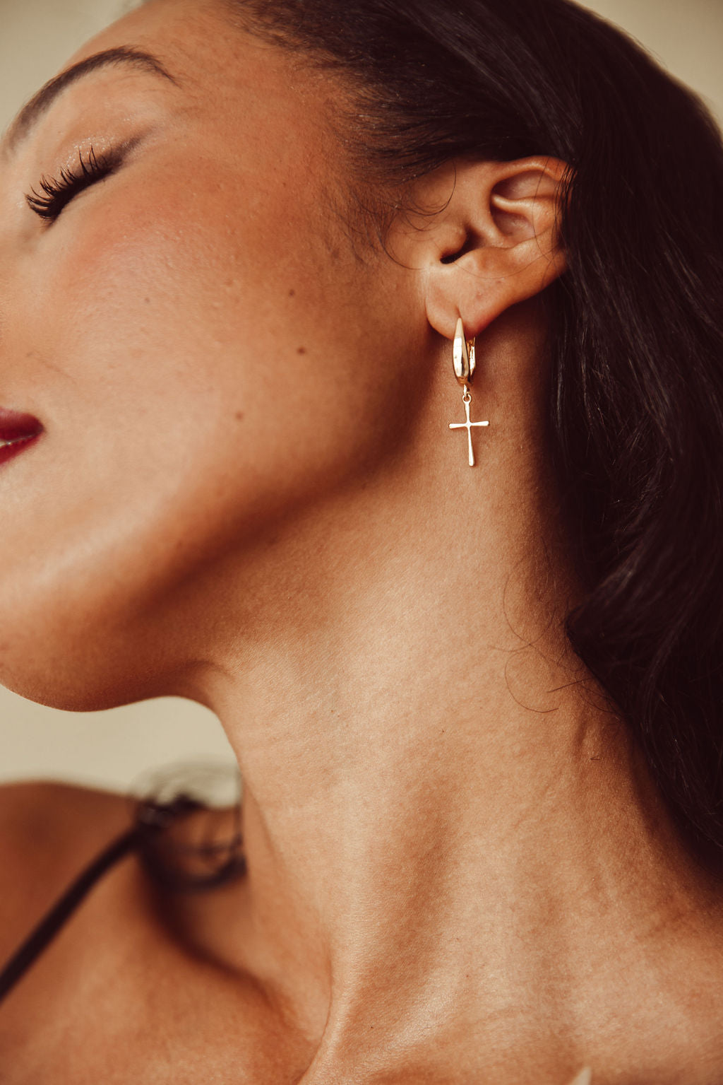 Deze oorbel is met de hand gemaakt en bestaat uit een verfijnde 14k gold plated haaksluiting, gecombineerd met een elegant goudkleurig kruisje. De slanke vorm en minimalistische uitstraling maken dit ontwerp perfect voor wie houdt van pure klasse zonder overdaad. De haaksluiting geeft de oorbel een lichte, vloeiende beweging en laat het kruisje prachtig tot zijn recht komen.
