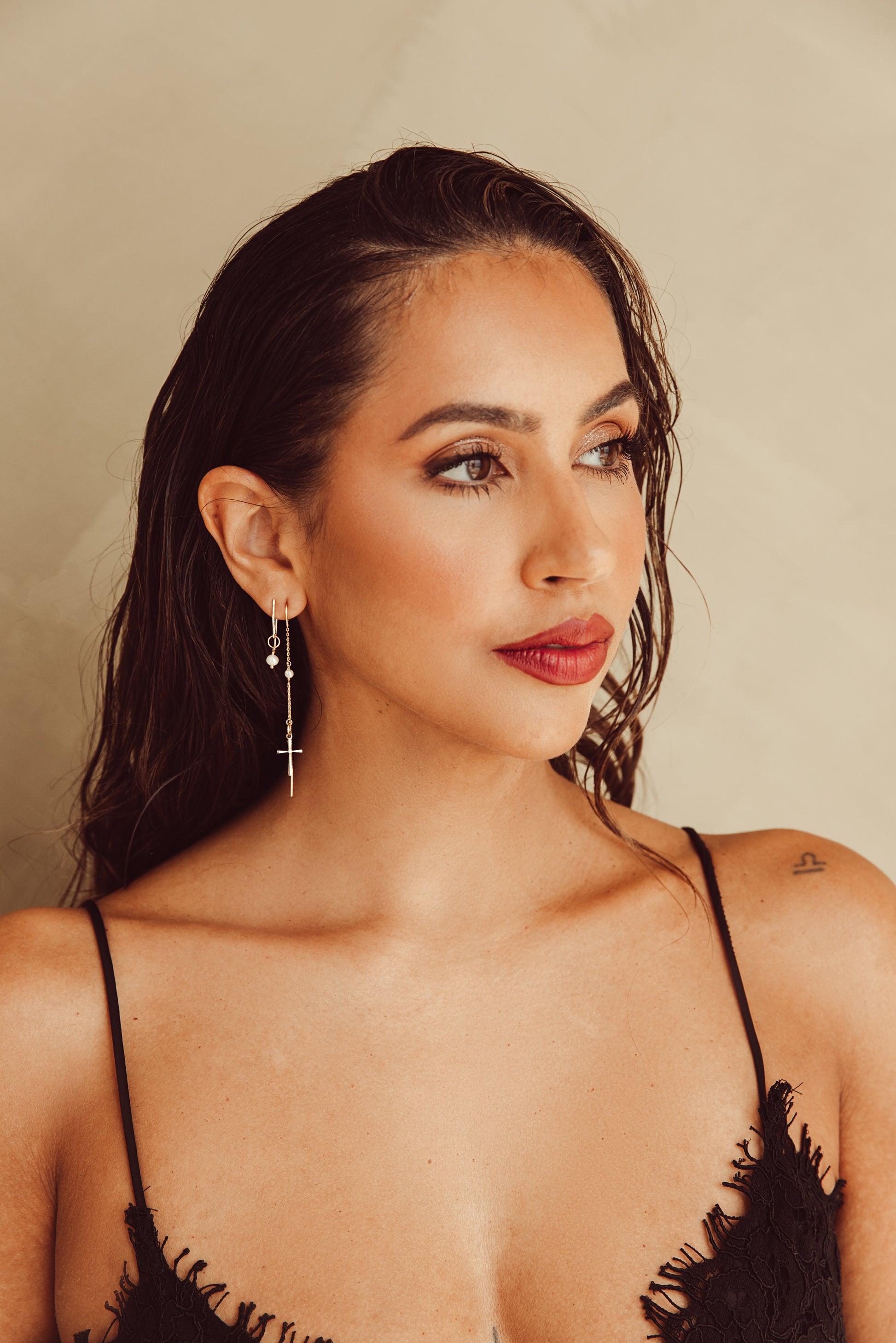 Deze oorbel is met de hand gemaakt en bestaat uit een sierlijke 14k gold plated haaksluiting, gecombineerd met een klein, glanzend pareltje. De minimalistische vorm en rustige uitstraling maken dit ontwerp perfect voor wie houdt van pure, tijdloze elegantie. De haaksluiting zorgt voor een lichte, vloeiende beweging, waardoor het pareltje mooi en subtiel meebeweegt.