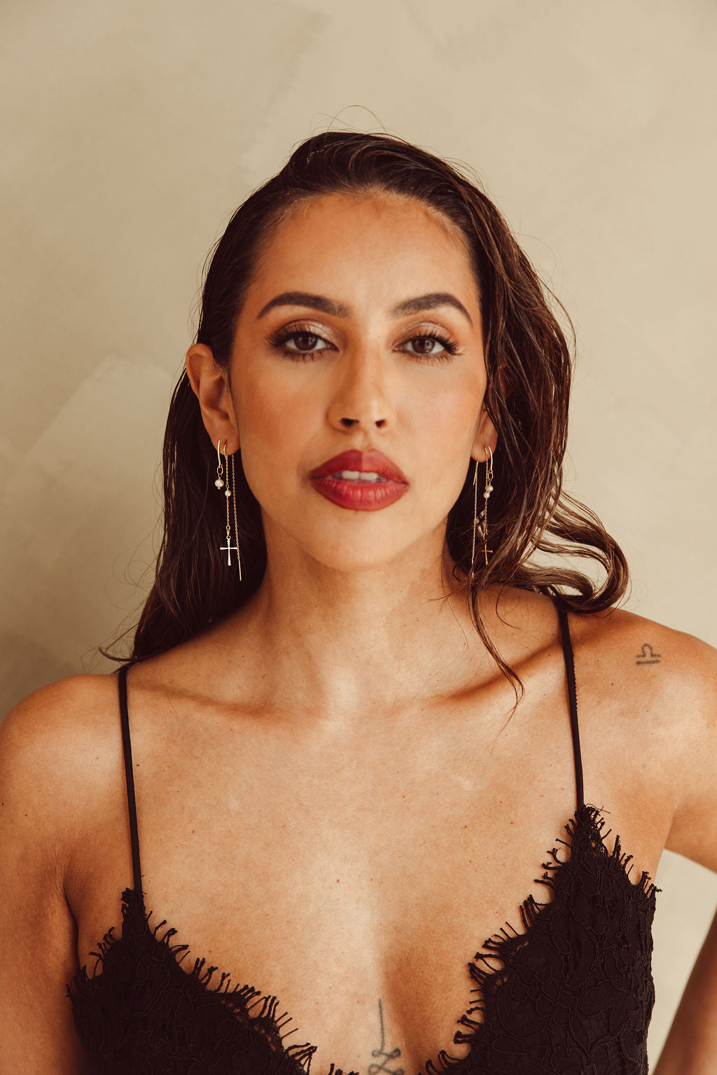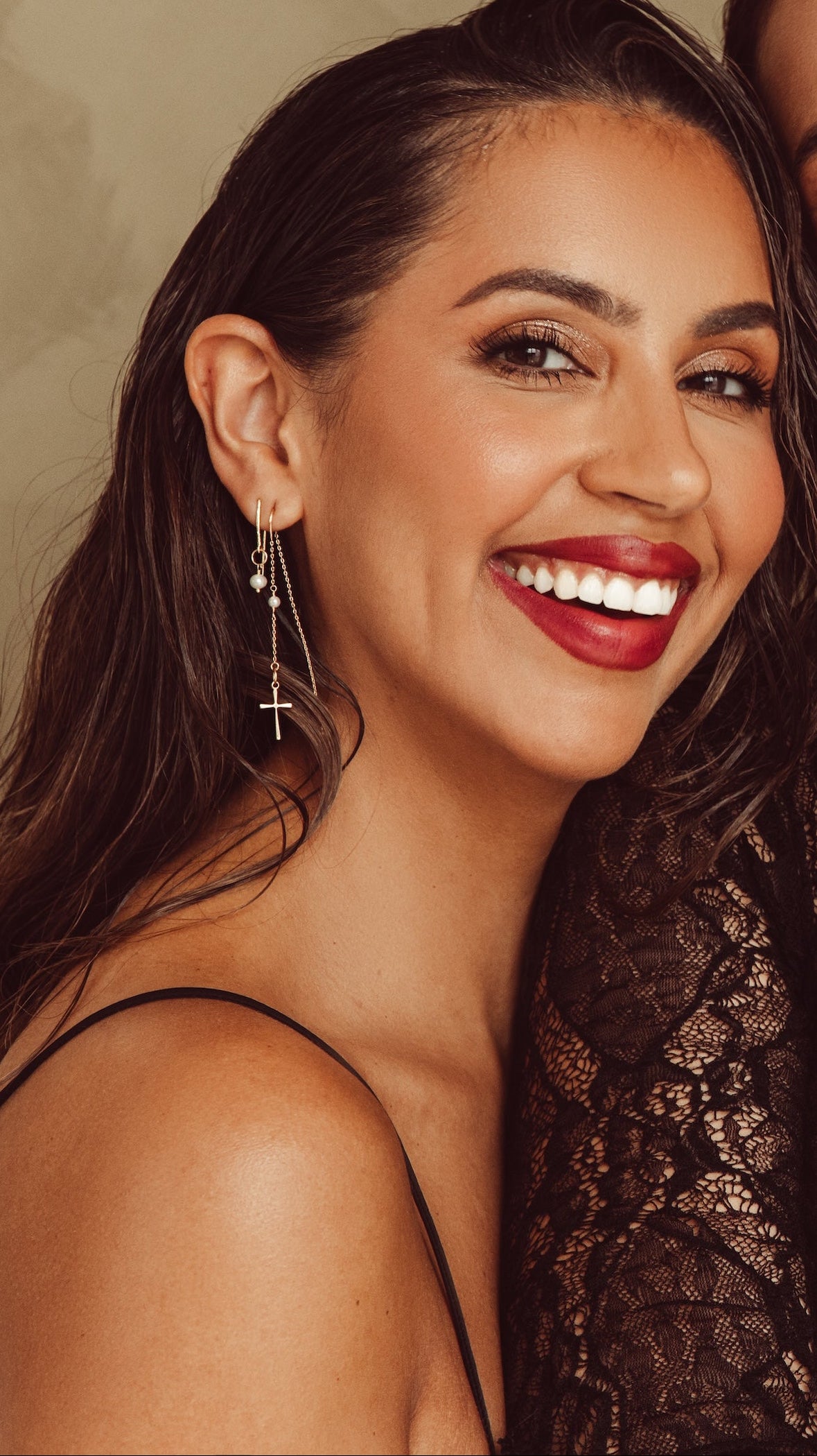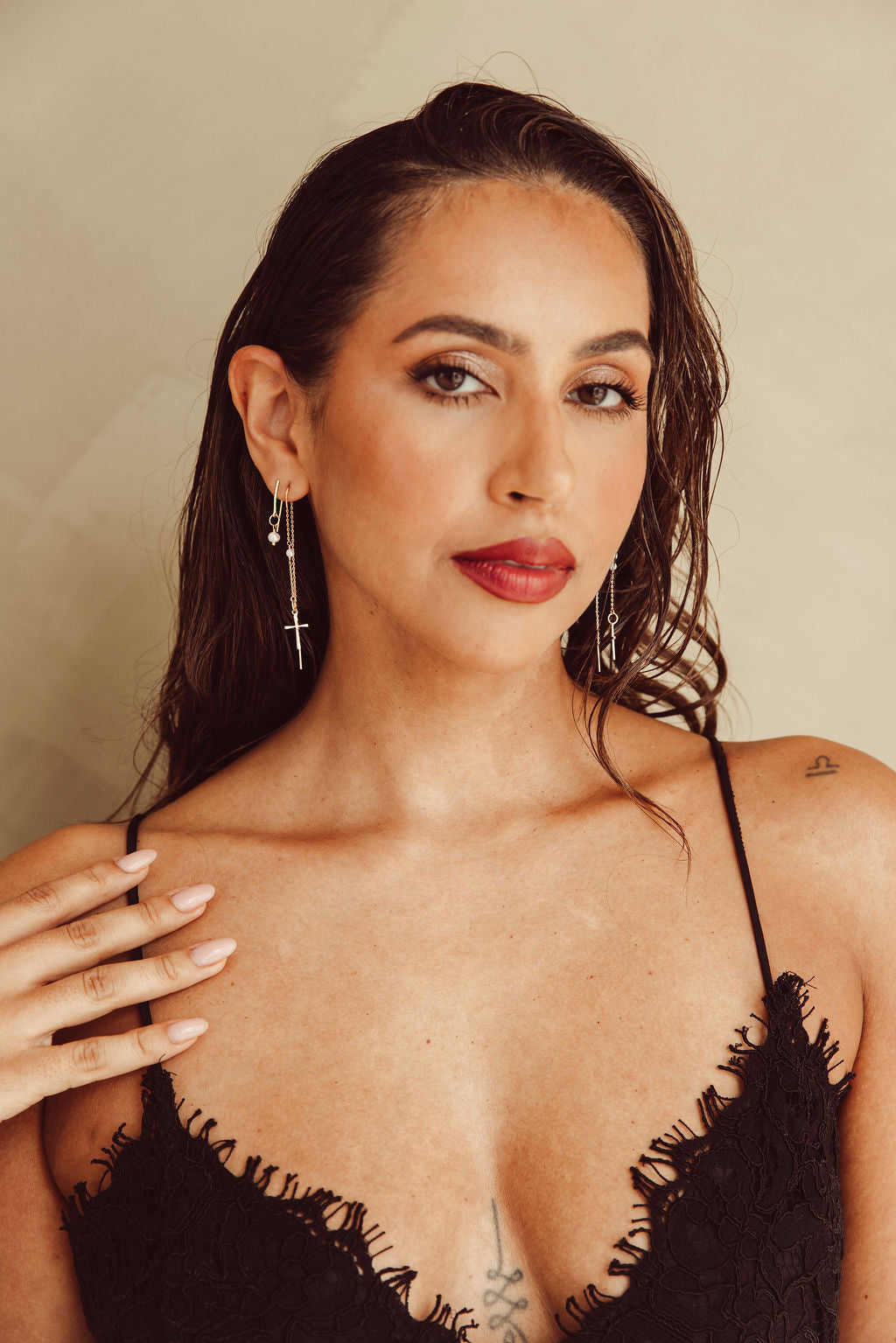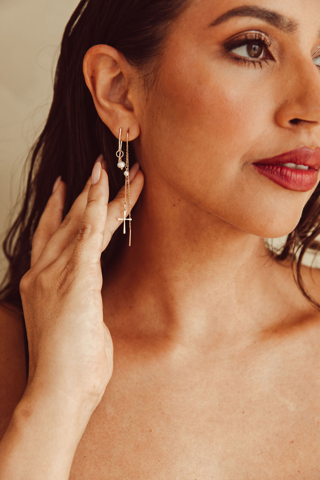 De oorbel bestaat uit een verfijnde 14K gold plated steker, gevolgd door een sierlijk verlengd goud element waar twee harmonieuze hangers aan bevestigd zijn: een klein, fijn vormgegeven kruisje en een zacht glanzend pareltje. Het kruisje staat voor bescherming en vertrouwen, terwijl de parel symbool staat voor puurheid, vrouwelijkheid en innerlijke rust. Dankzij het langwerpige ontwerp kun je de oorbel op meerdere manieren stylen, waardoor hij zowel subtiel als opvallend gedragen kan worden.